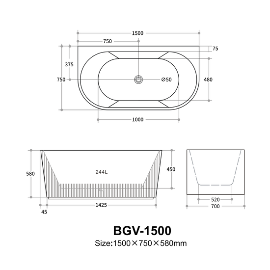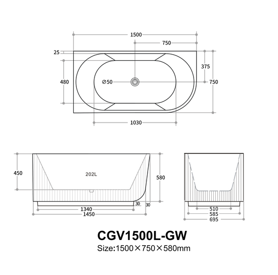 Bali Fluted Freestanding Back to Wall Bathtub 1500/1700 BBAT1500GW-MW-MB/BBAT1700GW-MW-MB