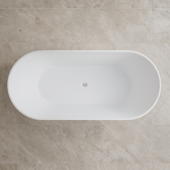A modern oval freestanding bathtub designed to fit neatly into left or right corners, saving space while adding elegance. With adjustable legs for easy installation, it’s available in multiple finishes and sizes to suit any bathroom style.