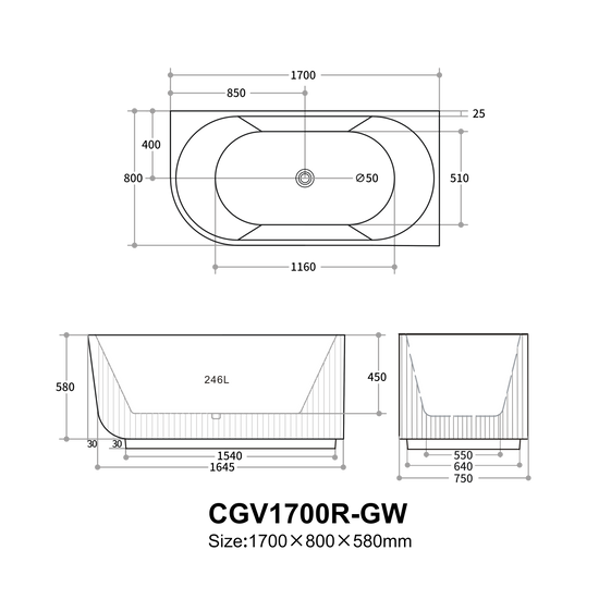 Capri Fluted Corner Freestanding Bathtub 1500/1700mm CBAT1500L/R-GW/MW/MB/CBAT1700L/R-GW/MW/MB