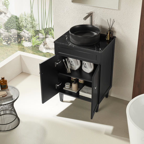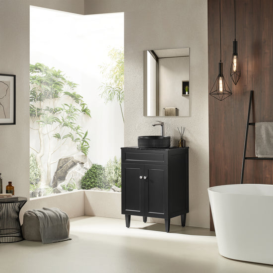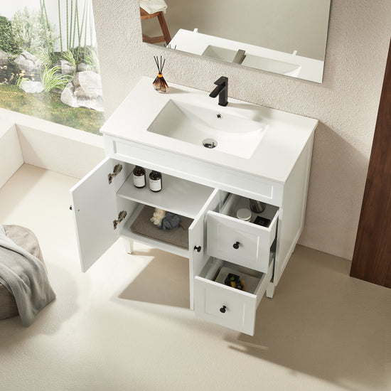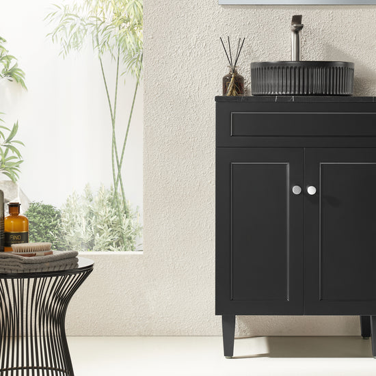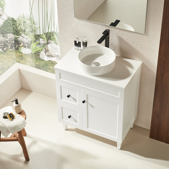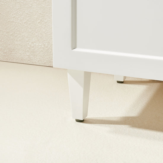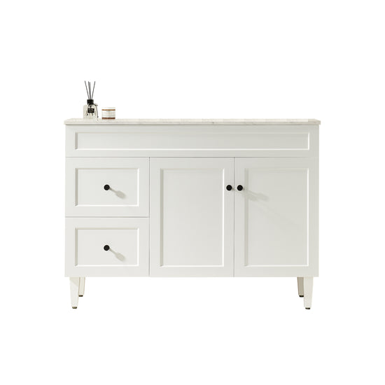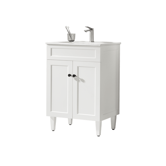 This bathroom cabinet features a pure white main color, being simple and elegant. A textured countertop basin is matched on top. The cabinet adopts a double - door design, providing ample storage space, and is supported by delicate feet at the bottom. With a neat overall shape, it can easily fit into various bathroom styles, adding tidiness and elegance to the space.