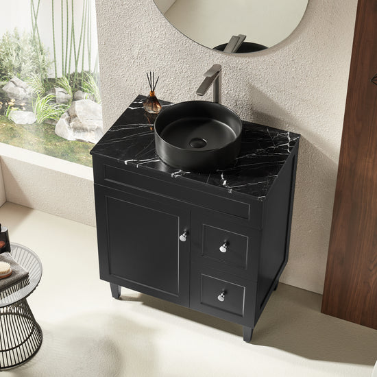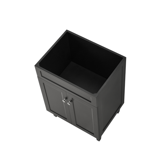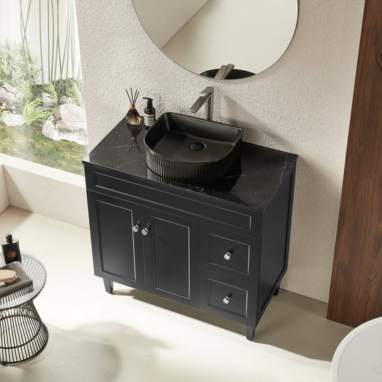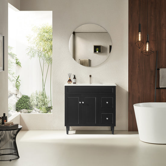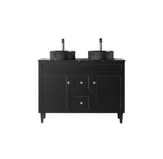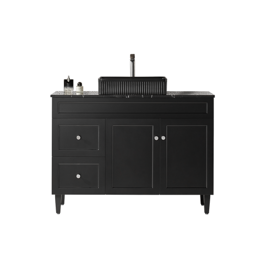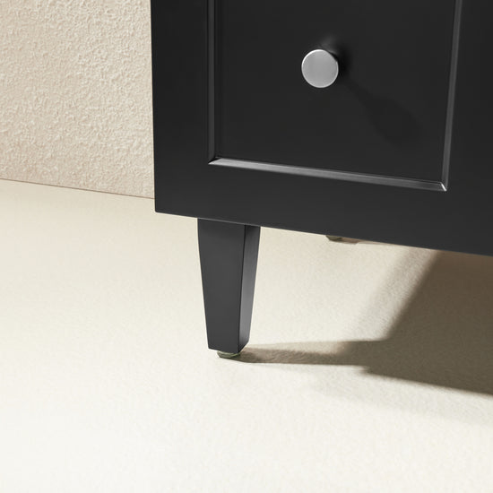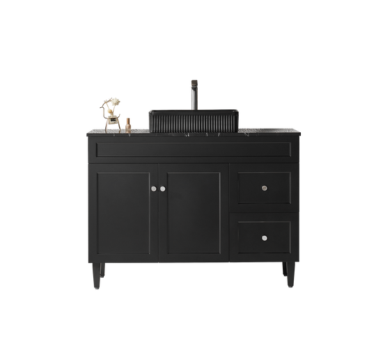 It fully demonstrates a sense of calmness, grandeur and high-end texture. The cabinet has a simple and neat shape with smooth lines. The silver metal handles of the cabinet doors and drawers are exquisite and eye-catching, adding a sense of fashion and delicacy to the whole. In terms of function, it has sufficient storage space. The combination of double-door cabinet and double-layer drawers makes it easily adaptable to various modern bathroom decoration styles.