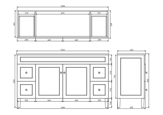 VITO Hamilton Floor PVC Cabinet Soft Closing Doors,Middle Drawers 1500mm HMT154DL-MW/MB
